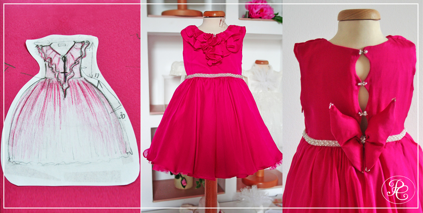 For Miriam, we chose a cute christening dress, made from a breezy chiffon silk in the brightest hue of pink, decorated with delicate frills and accesorized with puffy butterflies and tiny pearls, expecially crafted for the prettiest baby girl.