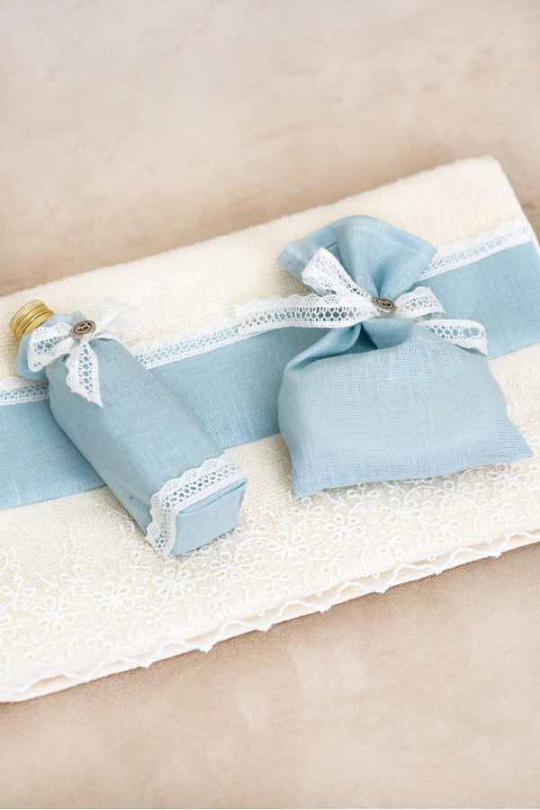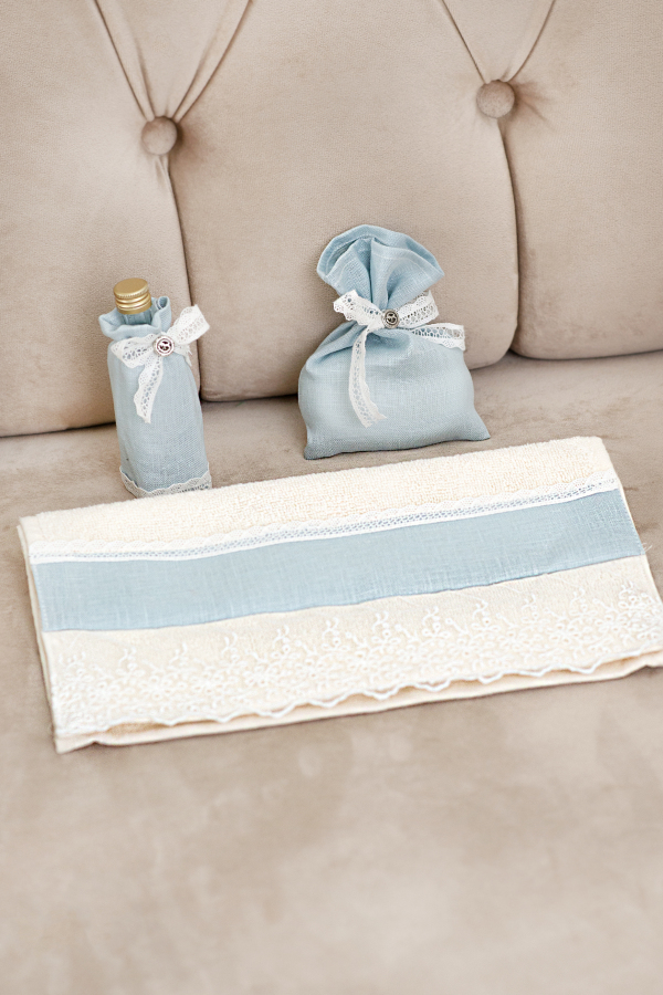 Delicate Christening priest set, compounding: priest small towel, soap, and chrism (myrrh) bottle.