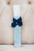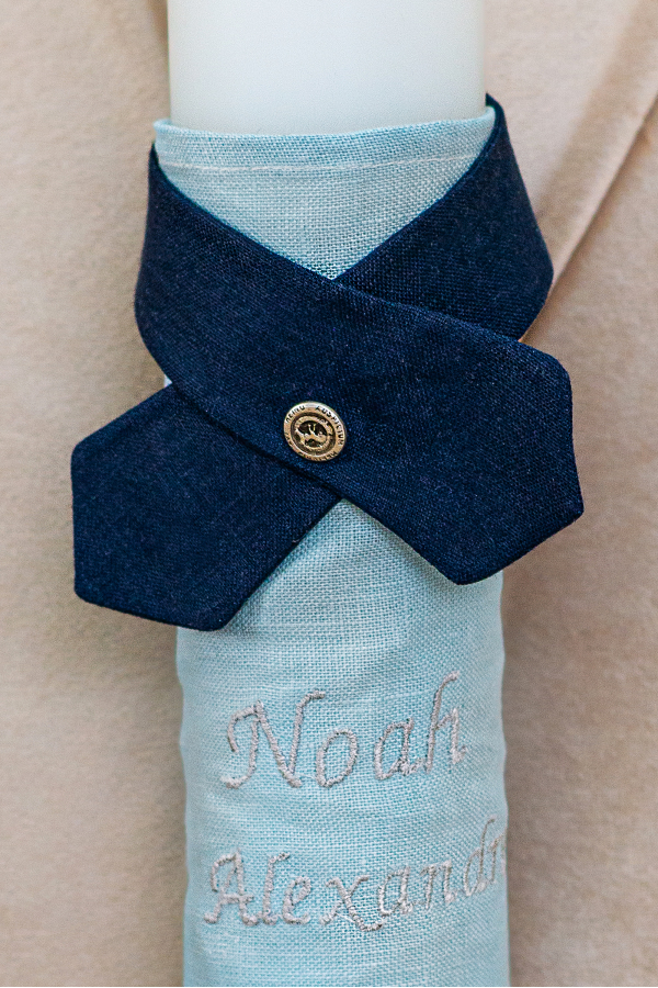 Elegant and sweet christening candle decorated with macrame lace and a miniature tie.