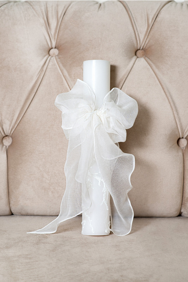 An elegant Christening candle, decorated with a silk veil bow and for a touch of sparkle, we added small, delicate sequins