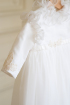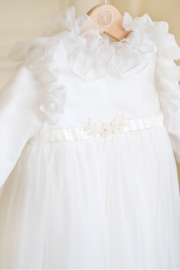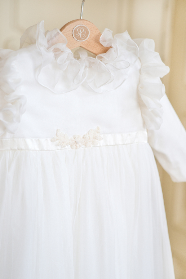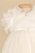 Grace - Catholic Christening dress made of embroidered silk veil and ruffles, on ivory