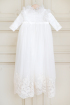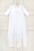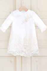 Catholic style christening gown for girls, made of finely embroidered silk chiffon, on ivory shades. Fine applications of hand-cut and sewn lace, as well as chiffon ruffles, perfectly complete this delicate style.