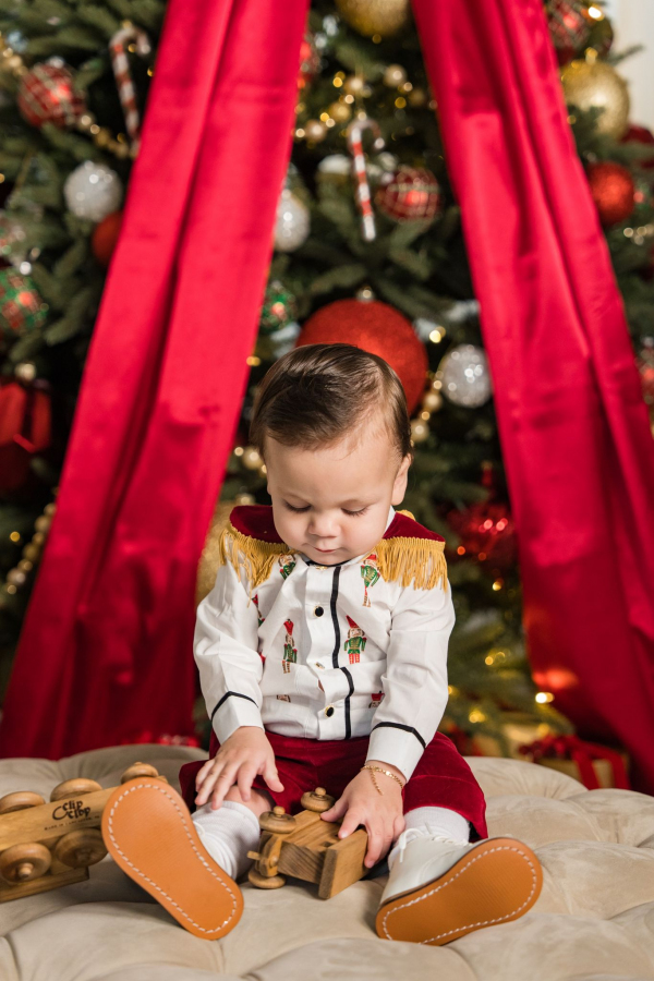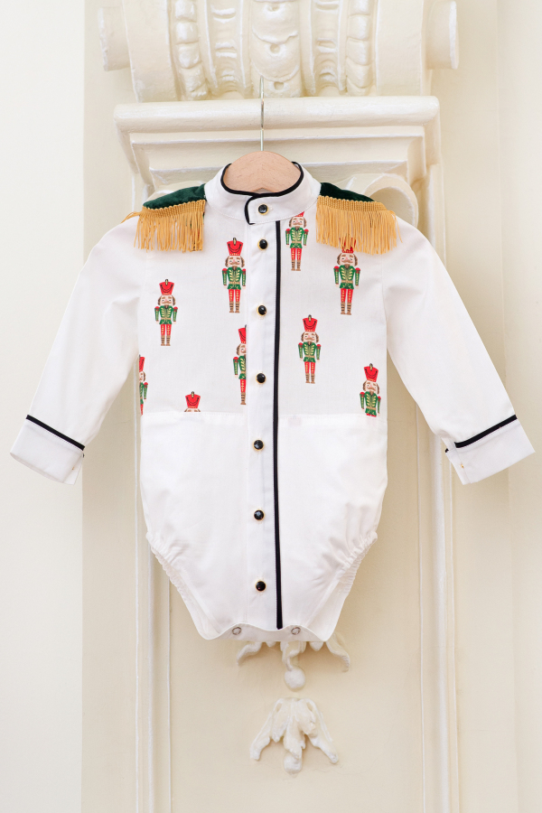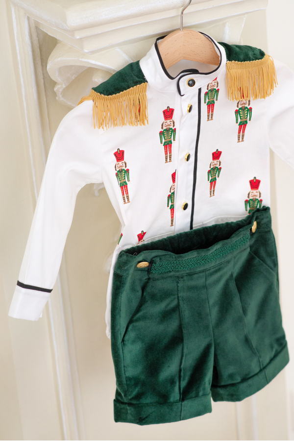Happy Holidays! the army of nutcrackers is wishing us. An interesting outfit, consisting of a shirt with velvet epaulettes and a pair of comfortable shorts. The contrast between the dark green and the ivory of the shirt will make the little one stand out at every party. Intead of dark green, there are also other color options.