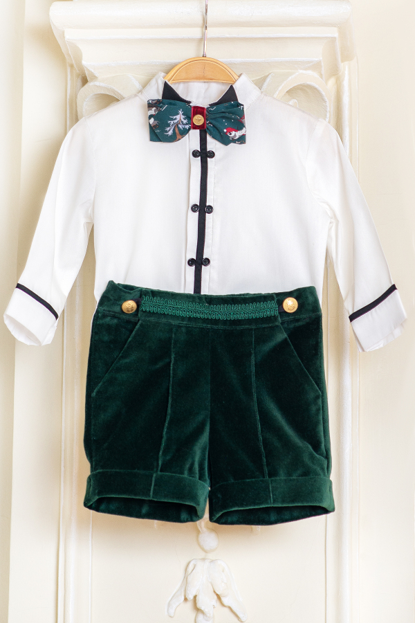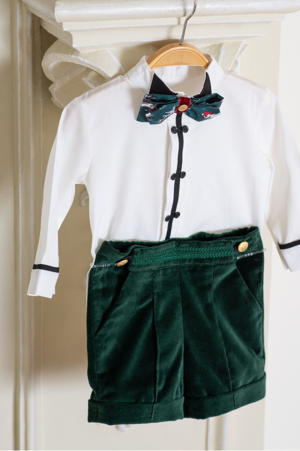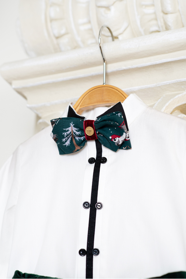 A cute Christmas-themed suit, perfect for the little ones! The shorts are crafted from soft cotton velvet in an elegant dark green, while the delicate shirt with black accents adds a gentle touch. A festive bow tie completes the look, making it an adorable choice for the holiday season.
