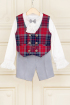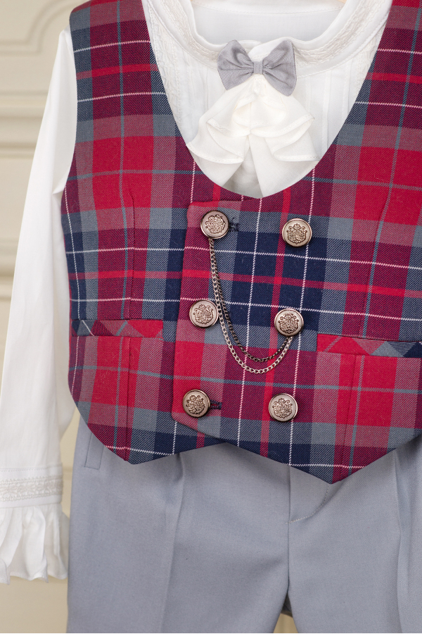 Elegant suit for boys, with an aristocratic chic air, given by the shirt's fine lace details and ruffled cuffs, but also by the jabot bow tie. The suit has a checkered vest and short pants, perfect to be worn with a pair of chic shoes and high socks, but you can also choose to have long trousers.