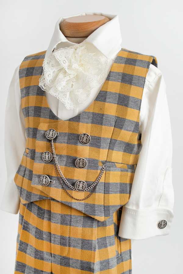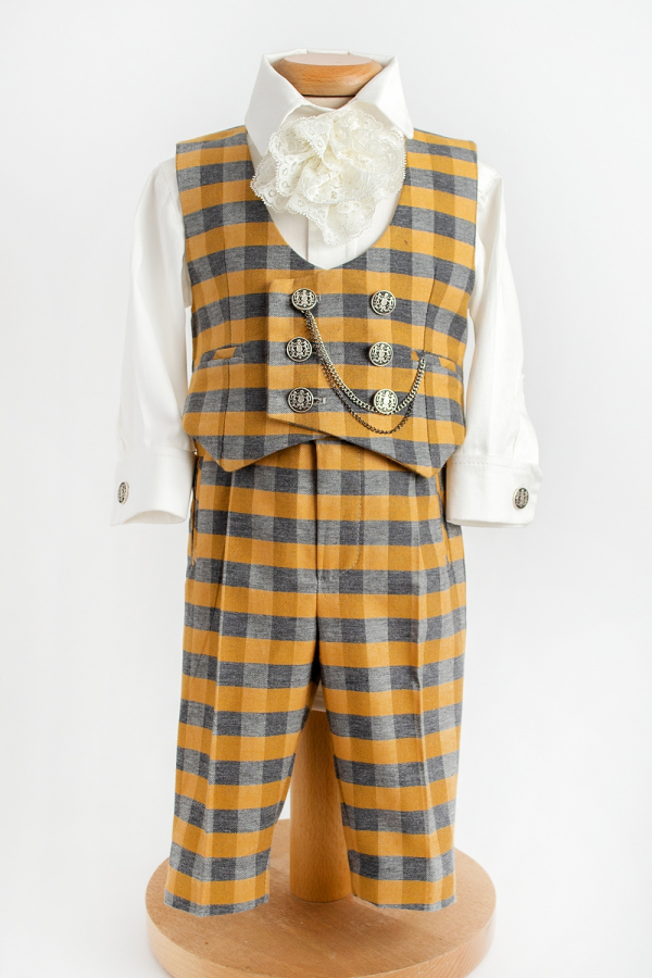 Golden Tweed is a chic vintage suit for the most elegant little one. In warm yellow-gold, ivory and gray shades, with a lace jab, metallic buttons & chain jacket, this is a great outfit for baptism, a wedding or any fine party.