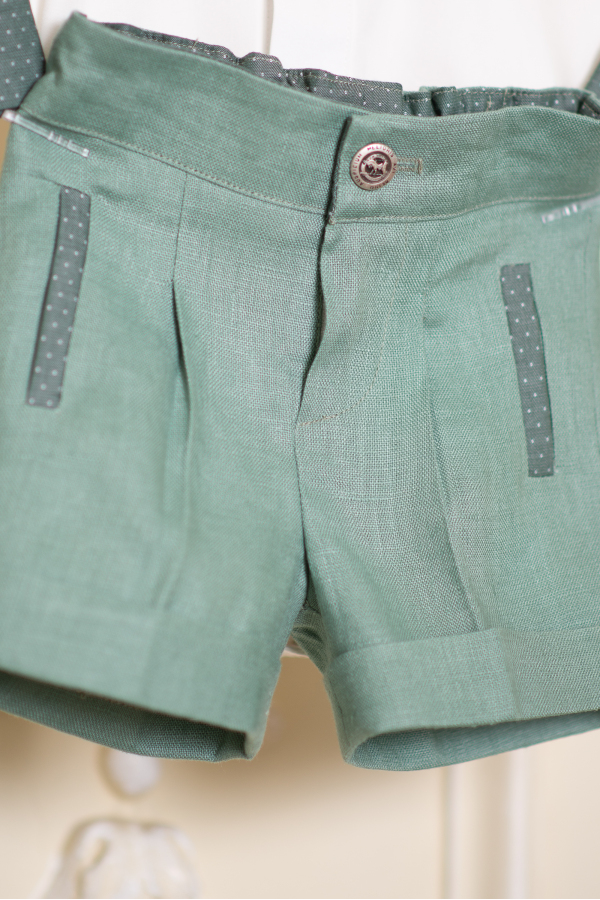 A delicate linen boy suit, in a diaphanous shade of minty green. The delicate metal decoration adds an extra joy to the outfit. This design is perfect for a hot summer day.