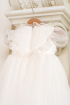 Delicate christening dress, made of precious silk chiffon with fine applications of beads embroidered lace. The delicate ruffles give an airy and summery vibe to the design. The beautiful transparent sleeves complete this uniqe royal design.