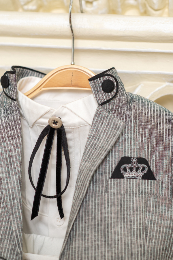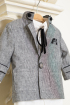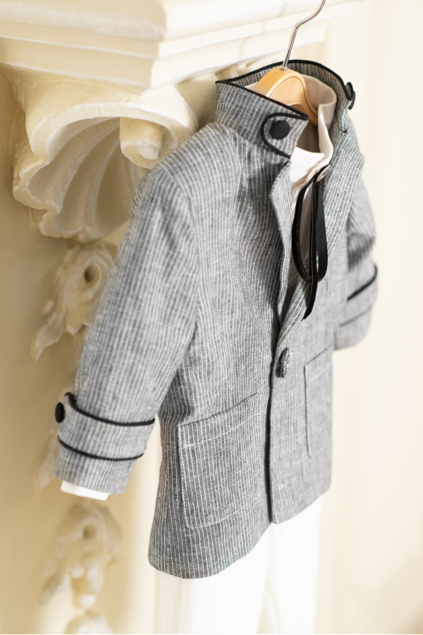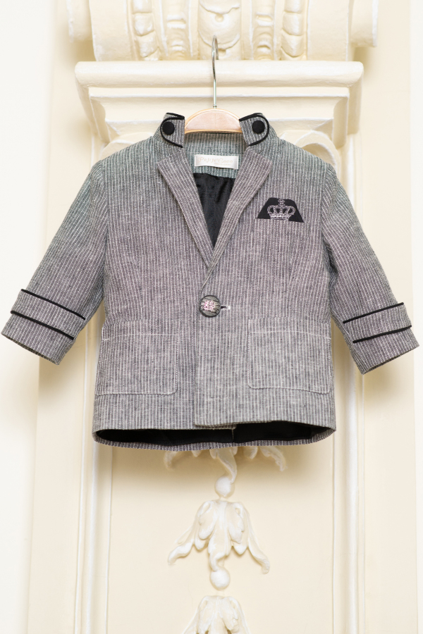 Elegant linen coat for children, with fine stripes, in shades of greu and black. This coat will be the ideal outfit for both a more casual party, like a garden party, or an elegant one.