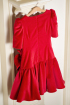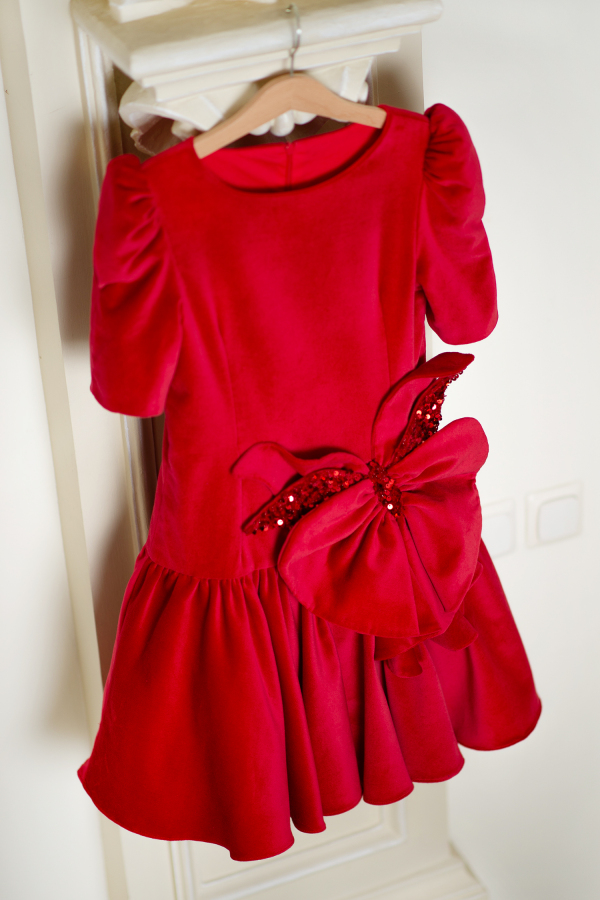 A beautiful dress made from cotton velvet in a brilliant shade of red and hand made details. The dress has a delicate design with a low waist and the hand made butterfly ads a plus of playfulness. The delicate red sequins make this design more festive.