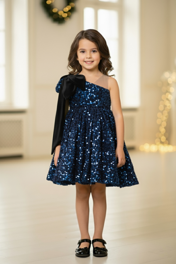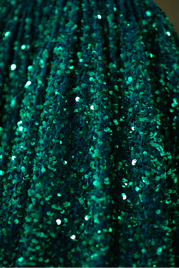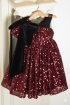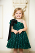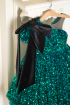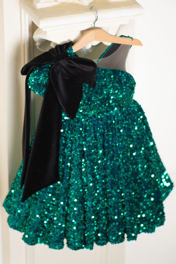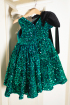 A wonderful sparkling dress for girls, made of glittering green sequins on a velvet base and decorated with an oversized bow. A perfect design for a little princess. The black bow makes a striking contrast with the brightness of the sequins.