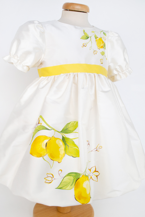 If it's summer, our thought goes to sunny countries and the Mediterranean. A theme reminds us of this feeling this is definitely the yellow sun of the lemons. On the dress "Lemonade" we painted the most beautiful lemons and flowering branches, directly on the natural silk in a cheerful tone and great attention to detail. Hand-painted by Alexandra Mudrac.