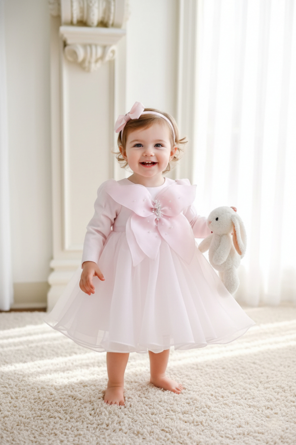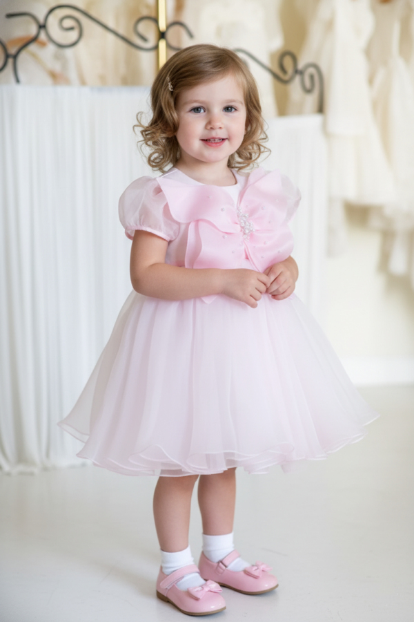 An exquisite gown designed for girls, made from natural silk organza to achieve a graceful and airy ensemble. The final touch is ahand made 3D buttefly, adorned with pearls, for a more chic and precious vibe.