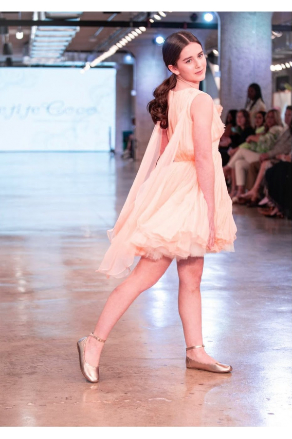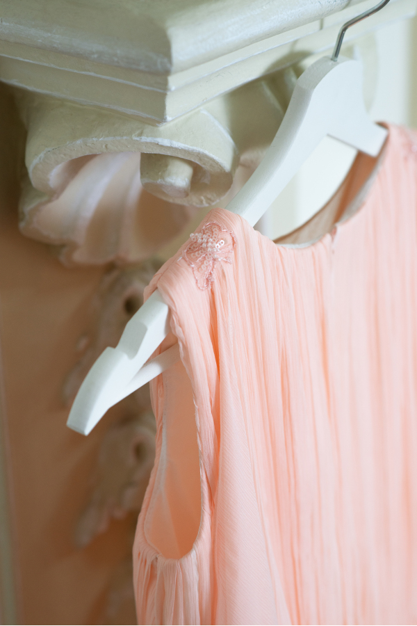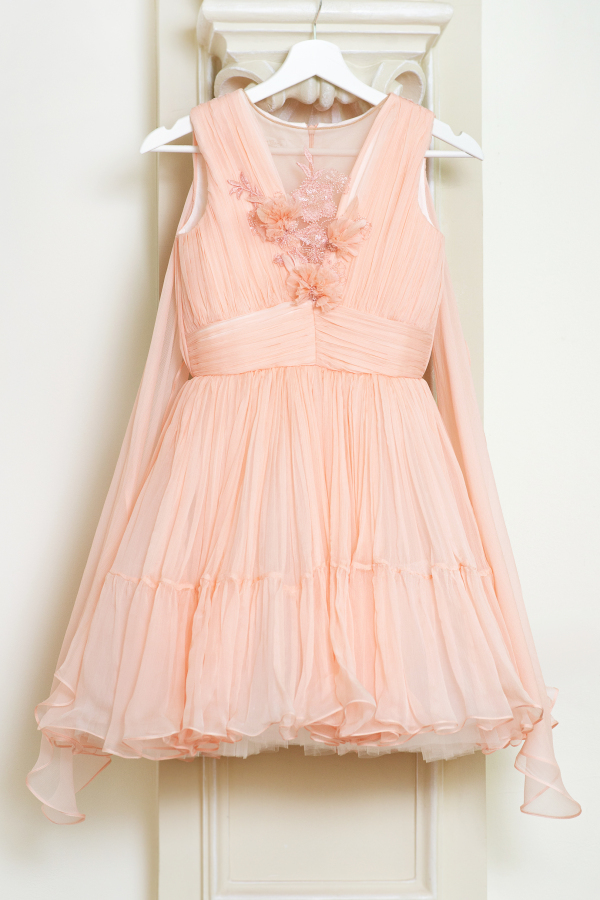 An enchanting design for girls, made of silk chiffon in a lovely shade of salmon and adorned with delicate lace flowers. The fairy like silk wings ad a touch of magic to the breeze and fluid drees. This outfit is perfect for a warm summer day.