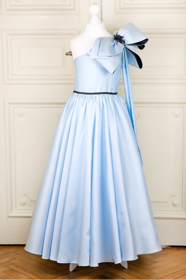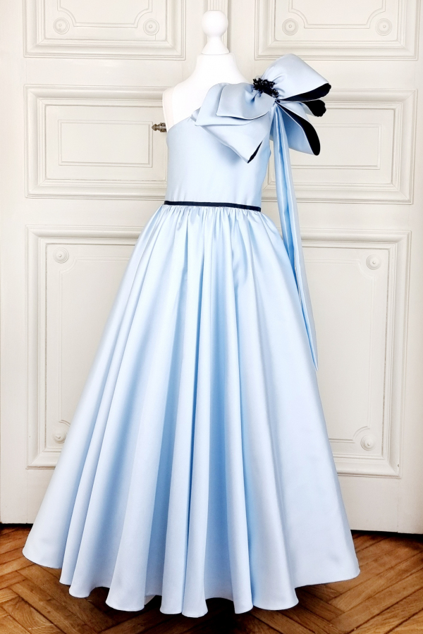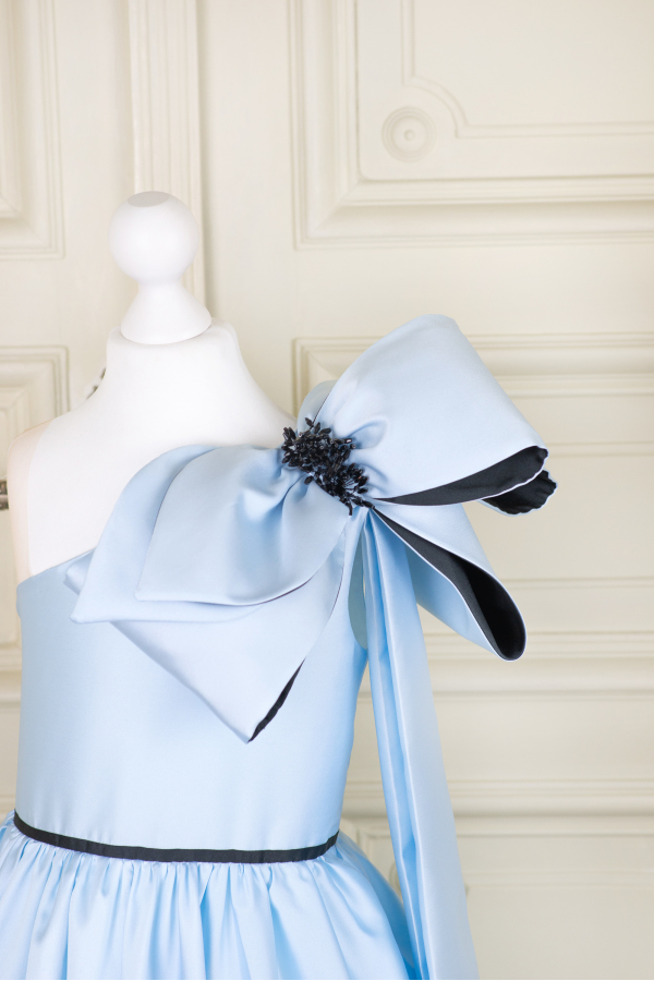 The luxurious Mikado fabric and elegant cut create a striking design. A statement bow adds glamour, while black details enhance its sophistication. The contrast between soft light blue and black accents gives it a bold yet refined look, perfect for special occasions.