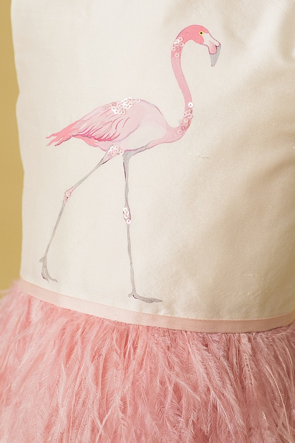 Hand-painted silk top, with vibrant soft pink ostrich feathers on the lower part, is one of the nicest combinations for a girl's party dress. Cute, but elegant, kids will just love the flamingo theme. "Birds of Paradise" Collection