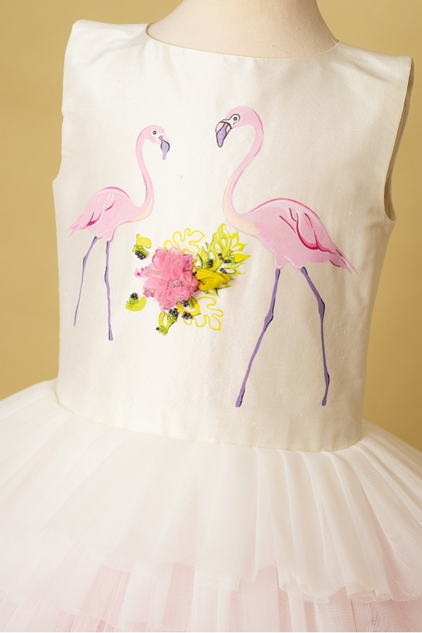 Hand-painted tutu party dress for girls on one of the most loved themes for kids, flamingos. Made of silk and tulle, in beautiful shades of pink an ivory, this dress is the perfect gift for a little mademoiselle. She would love to have it for her birthday! :) "Birds of Paradise" Collection.