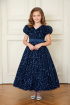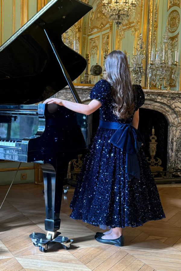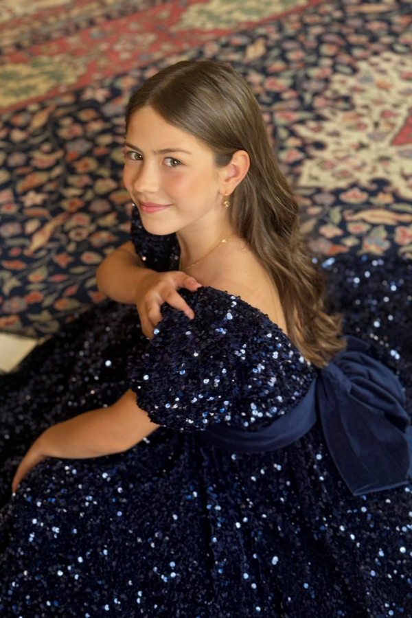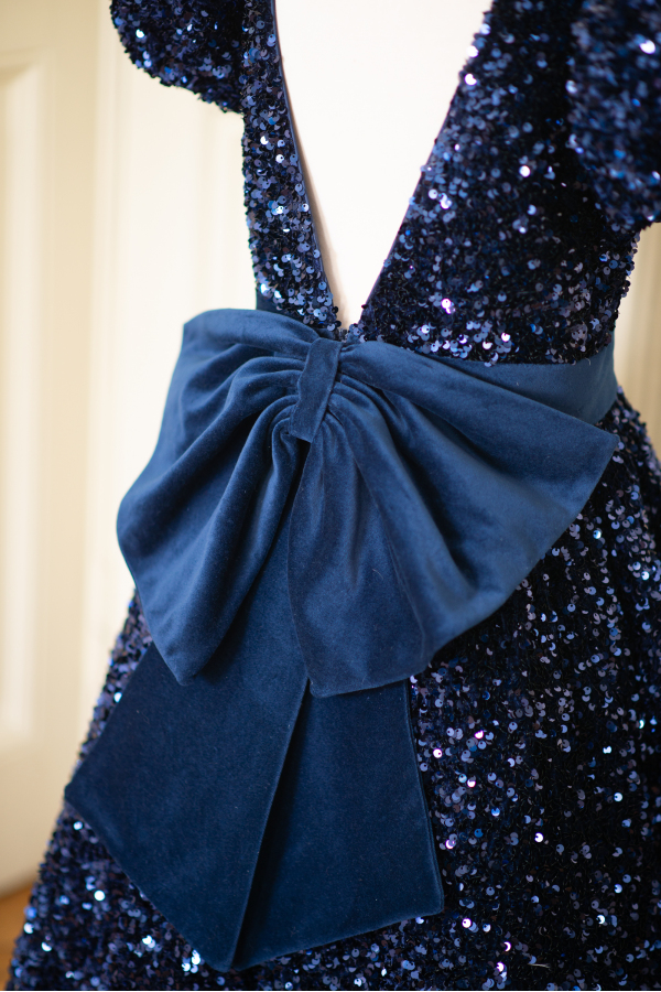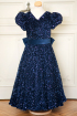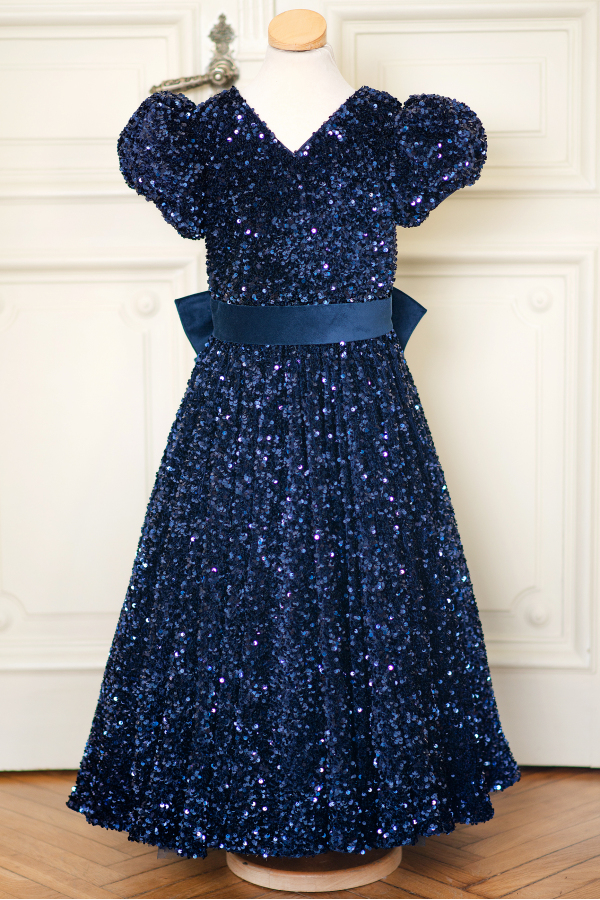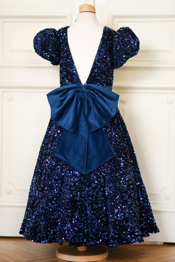 The perfect kids celebration dress for your little one! The luxurious navy blue sequin fabric and elegant cut are key to a glamourous look. The deep cut on the back as well as the beautiful bow adds sophistication.