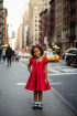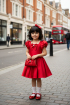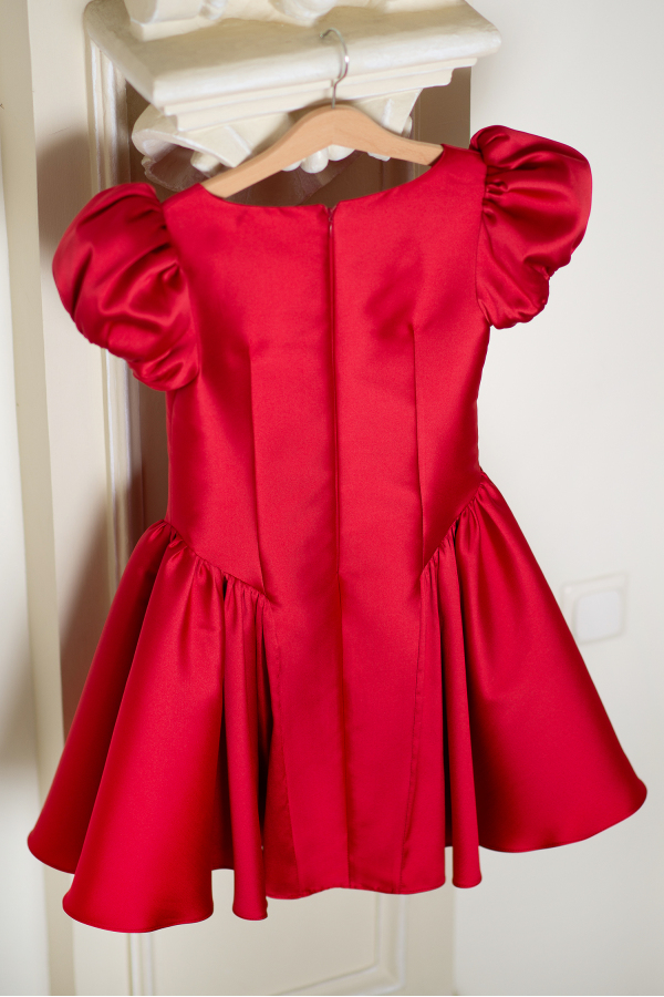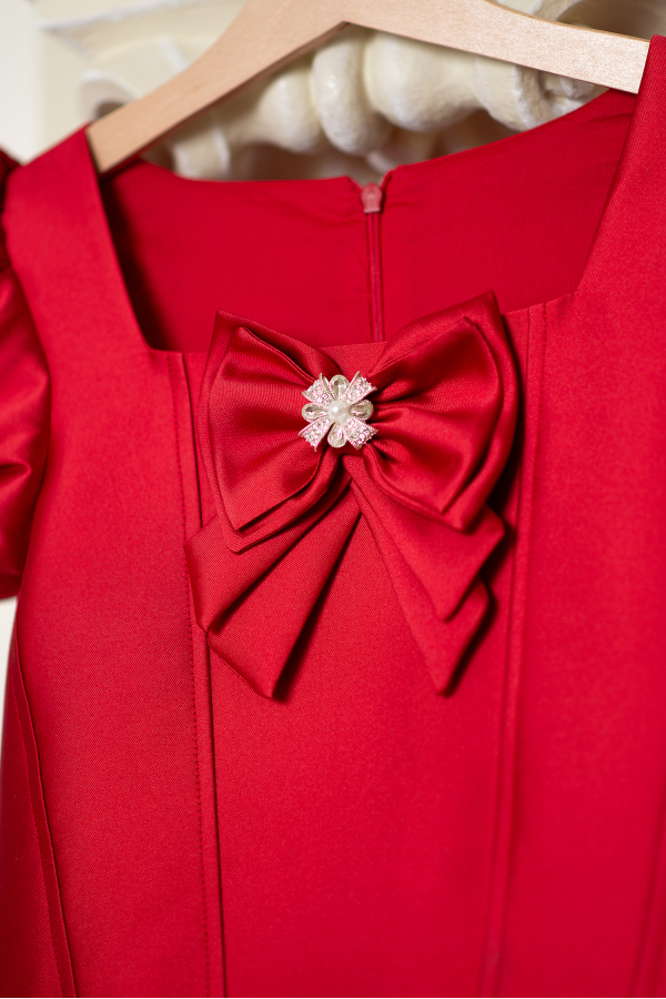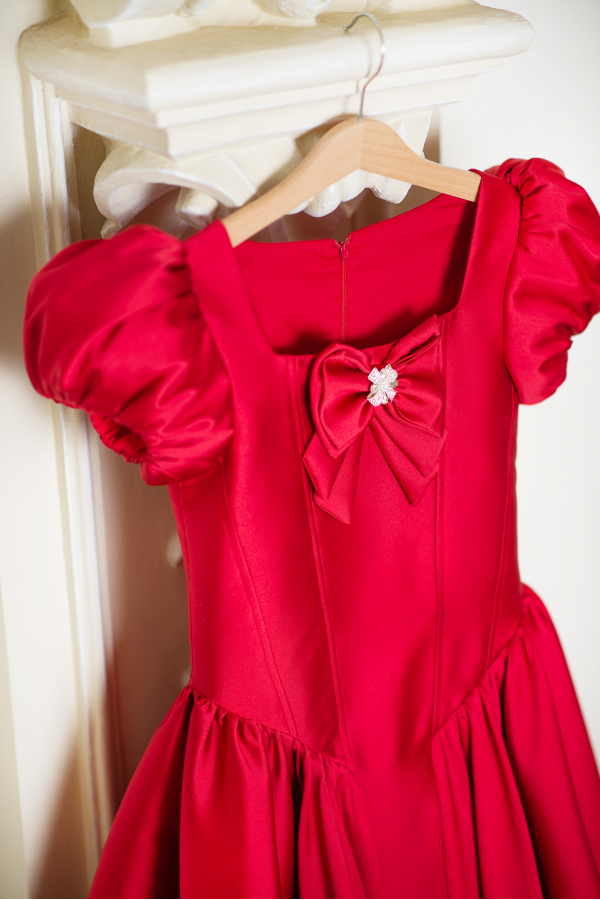 The rich texture of Mikado fabric, paired with a distinctive corset cut on the bodice, creates a striking and sophisticated design. A specially crafted bow in the same shade of red, adds a glamorous touch, while the sparckling decorations enhance its elegance. A wonderful design for the Winter Holidays, but also for her birthday or any other special occasion.