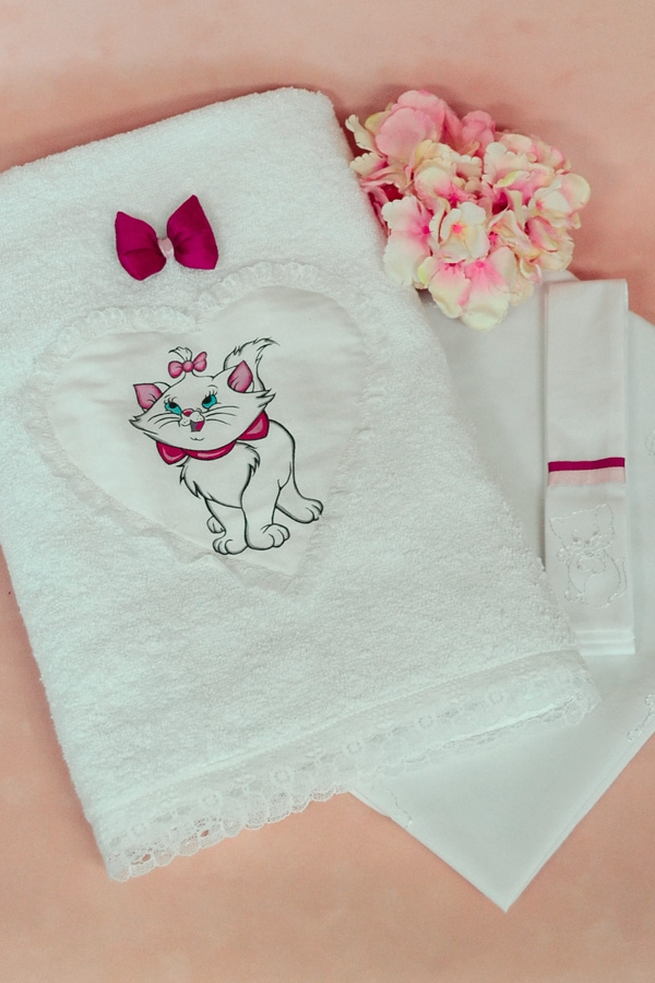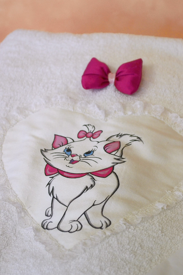 The little cat on the towel is hand painted with special textil colors.