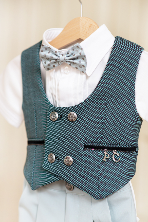 Summer suit for children, consisting of a vest, shorts and a shirt, in delicate shades of green. With velvet details and chains on the pockets, this costume will be the ideal outfit for any party. The silk bow tie offers an extra touch of elegance.