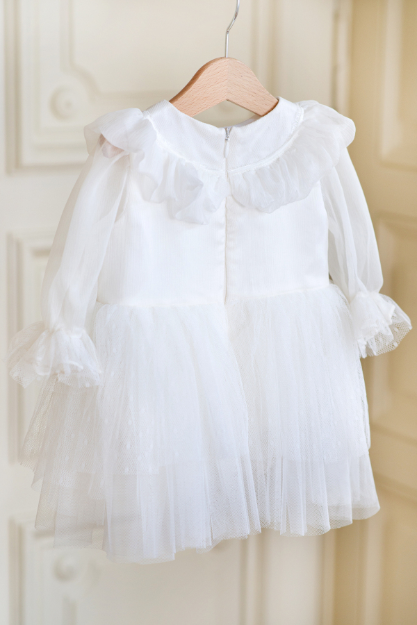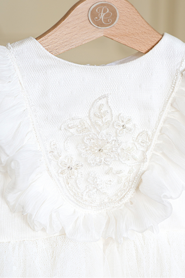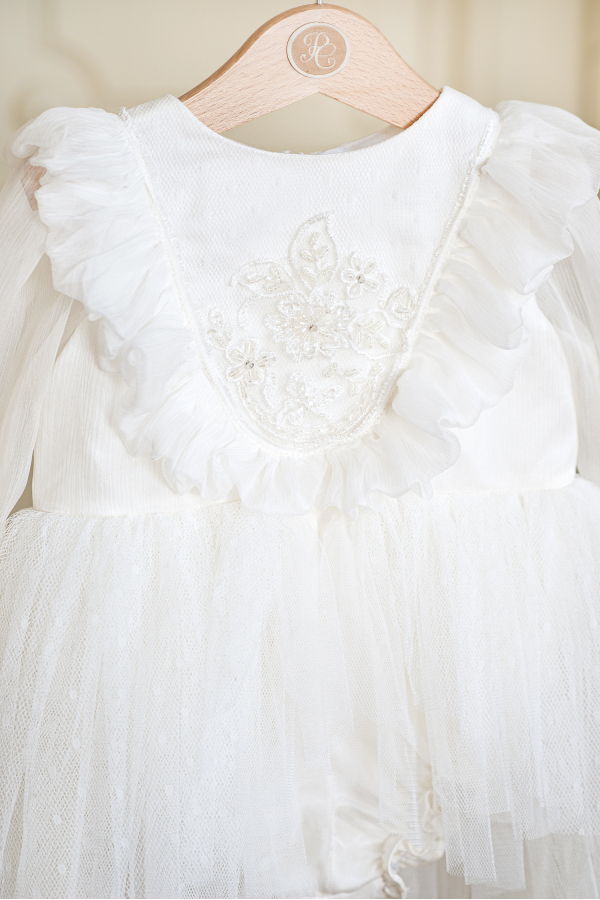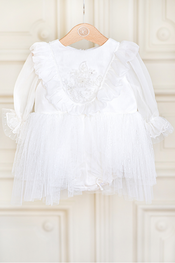 For unforgettable moments, you need an unforgettable outfit. A soft silk veil body with delicate tulle ruffles. The body is decorated with precious lace with beads and sequins. Ideal for a family photo shoot or for a special gift. The body closes with a zipper on the back.