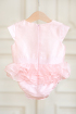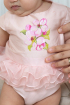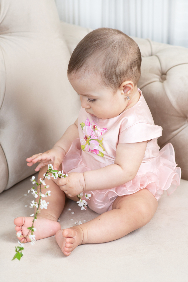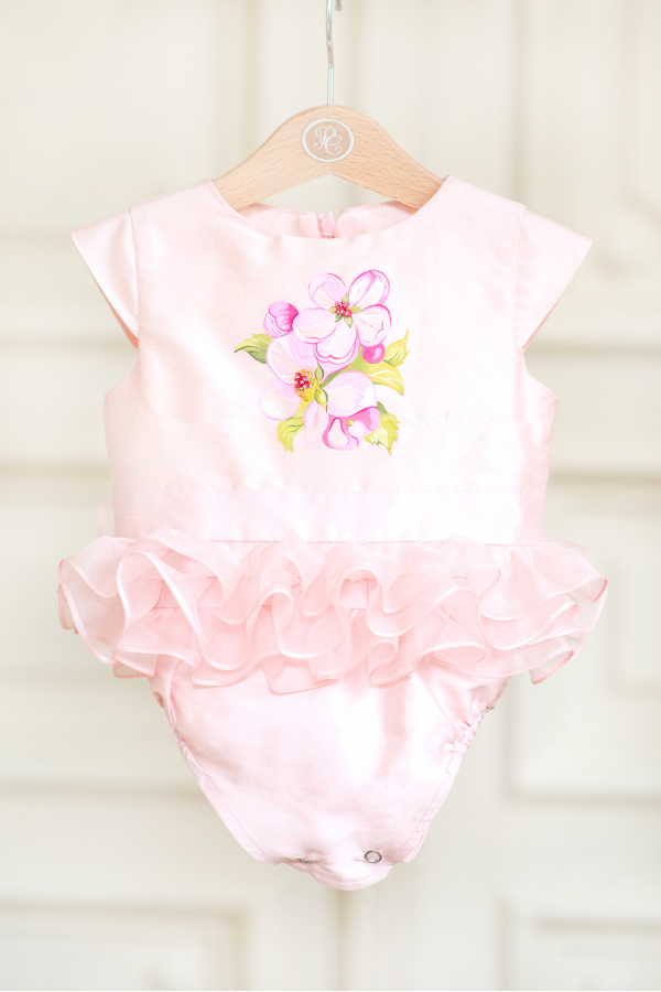 Silk shantung body, hand-painted in delicate shades of pink, a special outfit, but also light for the little ones. The ruffles are made of silk organza. Ideal for a family photo shoot or for a special gift. The body closes with metal staples between the legs and a zipper on the back.