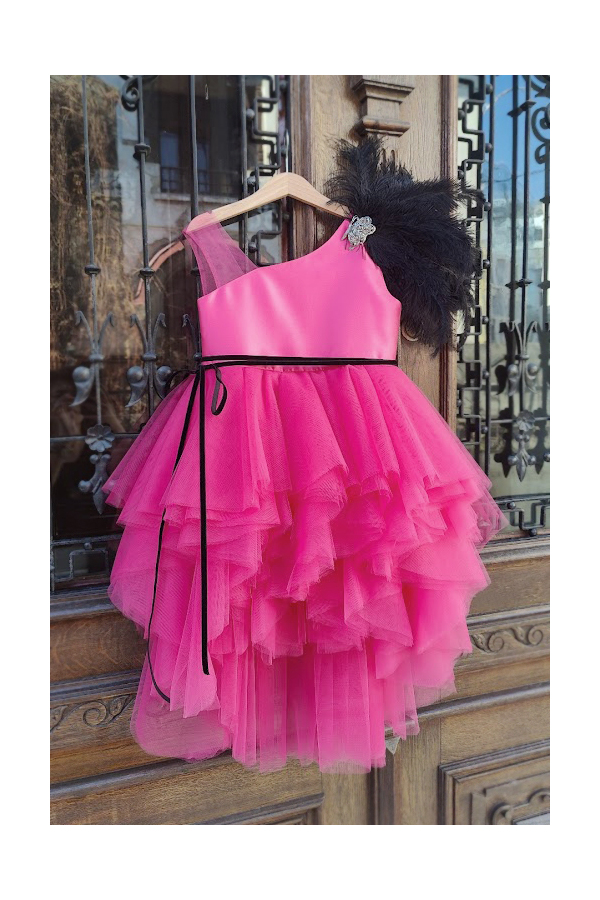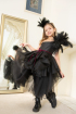 Special occasion black tutu dress for girls, with a hand made spectacular decoration made of feathers and rhinestones. The asymmetrical tulle ruffles and the one shoulder cut, make this design perfect for an unforgettable party.
