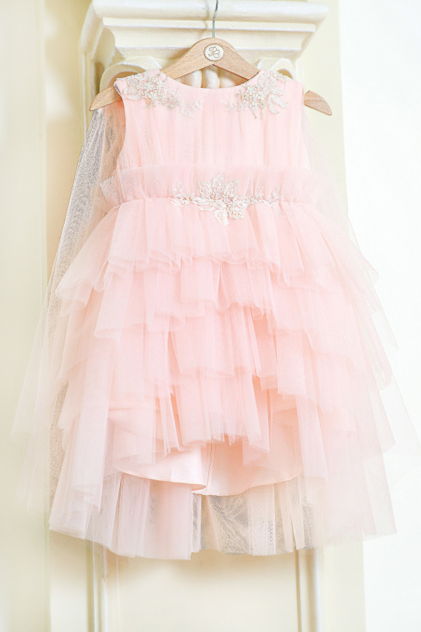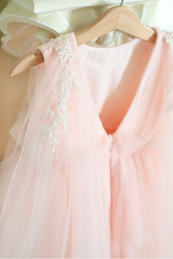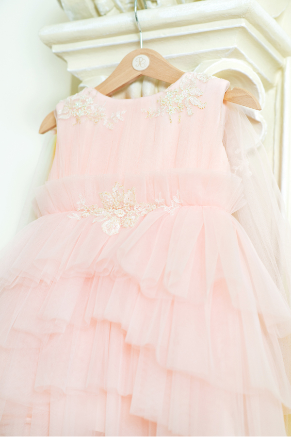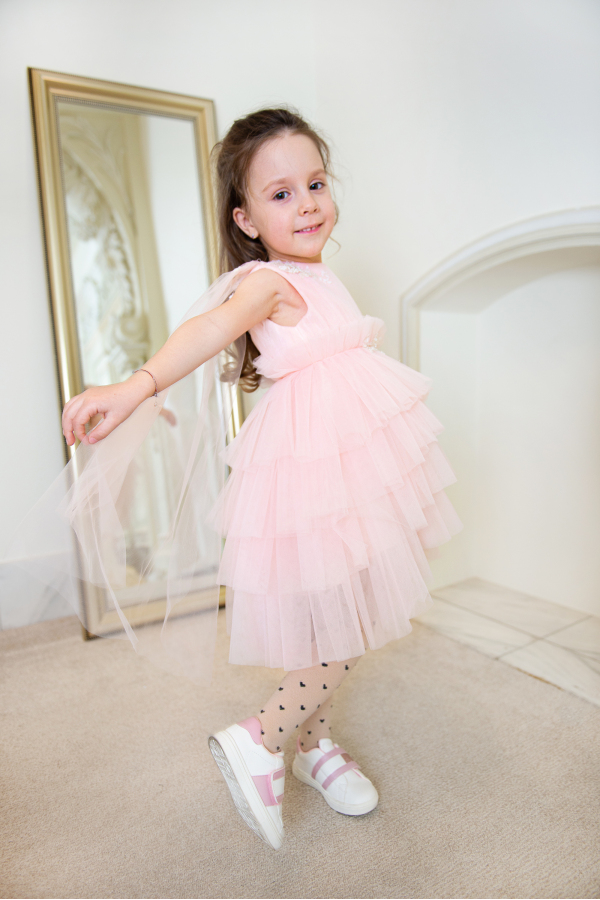 Goddess dress for girls, made of tulle, with train and ruffles, the bodice dressed in tulle and decorated with beautiful lace. The dress is perfect for a little flower girl, but also for a birthday or other special event.