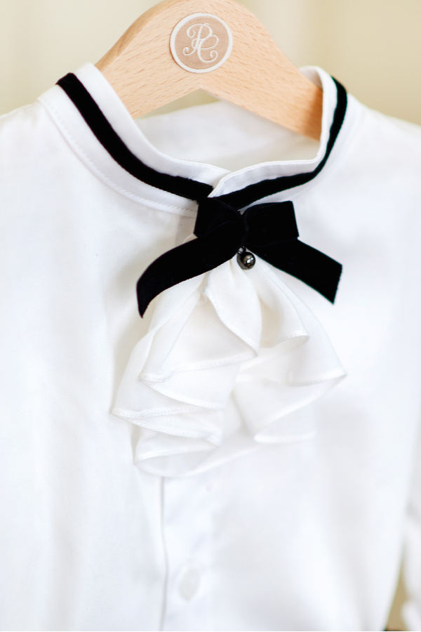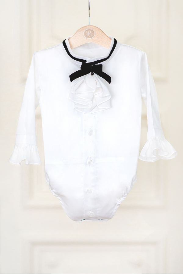 Camasa din bumbac fin cu mansete cu volan si jabou aplicat. Camasa este decorata cu o banda de catifea contrastanta a carei culoare se poate schimba la cerere. Camasa este potrivita atat pentru fete cat si pentru baieti.