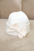 Caciulita din stofa ivoire, decorata cu o funda supradimensionata din shantung de matase.
