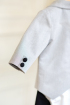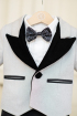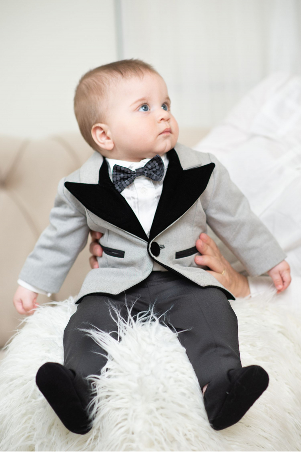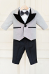 Costum de ocazie pentru baieti intr-o combinatie care va fi considerata mereu eleganta, gri cu negru. Sacoul are reverele din catifea, nasturei delicati la maneci si un decupaj chic la spate.Papionul din matase, acorda un plus de stralucire costumului.