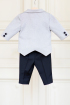 Piese: pantaloni, camasa cu body atasat (pentru varsta 0 - 1 an) si sacou.