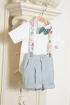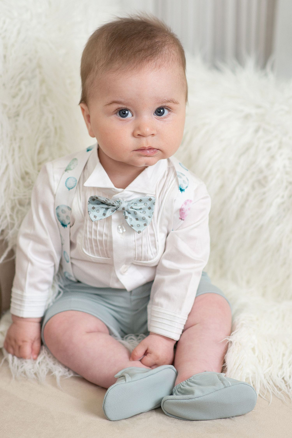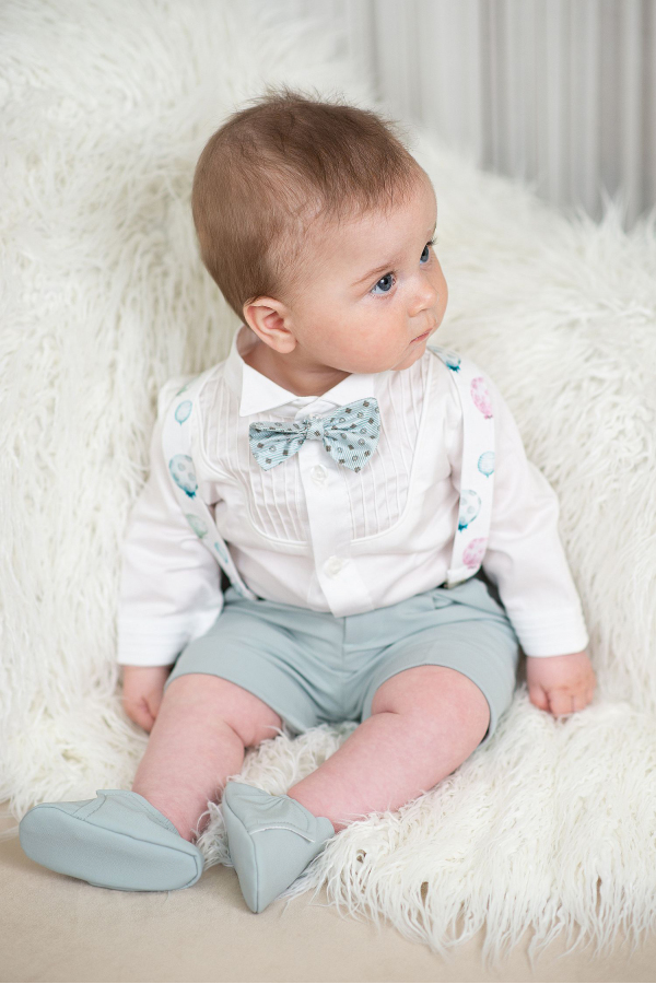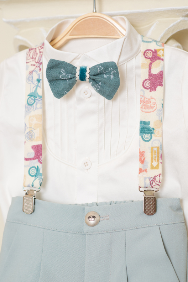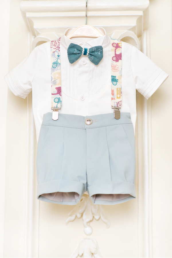 Costum de vara pentru copii, cu pantaloni scurti intr-o nuanta delicata de verde, camasa cu detalii discrete si papion din matase. Bretelele cu baloane dau un aer jucaus acestei tinute elegante.