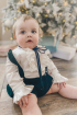 Costum minunat pentru băieți și copii mici, cu pantaloni scurți eleganti din catifea verde și detalii aurii. Costumul are o cămașă cu dantelă delicată și fundă din catifea. Bebelușul tău va arăta adorabil la orice petrecere sau ședință foto.