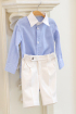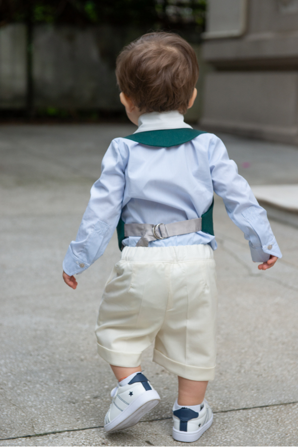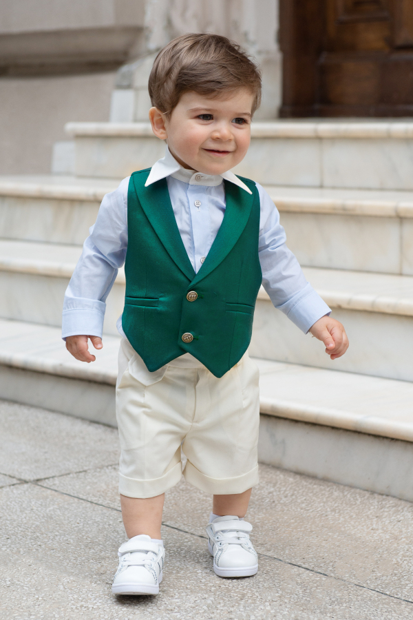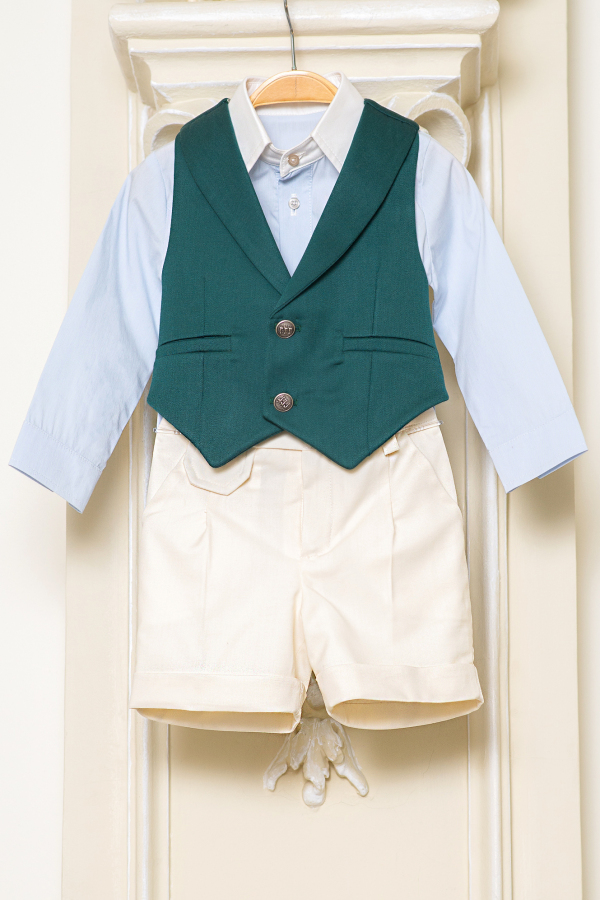 Costum casual chic pentru copii, format dintr-o vesta verde padure cu spatele gol, pantaloni scurti ivoar si camasa bleu cu guler ivoire. Vesta poate avea diferite culori in timp ce camasa va ramane bleu cu guler ivoire (sau integral ivoire, la cerere).