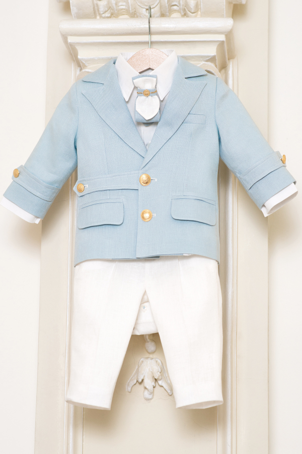 Un costum de vara din in in nuante delicate de bleu si ivoire. sacoul are un design deosebit cu detalii aurii. Pentru a completa aceasta tinuta, am adaugat o mini cravata in aceleasi culori si decorata cu un lant auriu.
