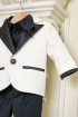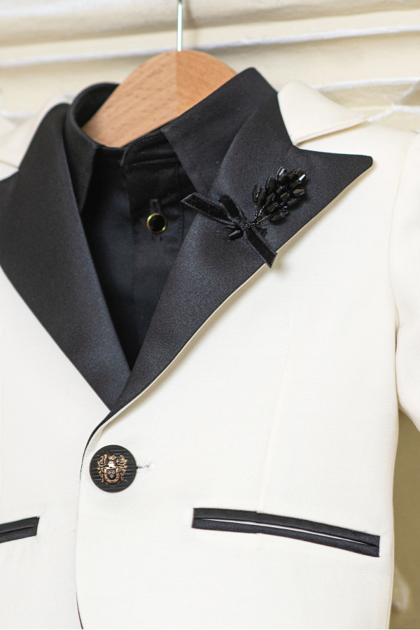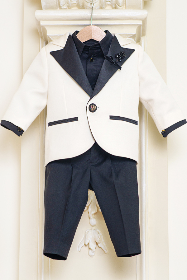 Costum elegant pentru baieti, din stofa neagra si ivoire, cu detalii delicate din tafta, potrivit atat pentru botez cat si pentru ziua de nastere a micutului, o sedinta foto sau o nunta. Mica floare stralucitoare de la rever, adauga o nota de glamour tinutei.