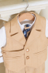 Costum elegant de in pentru copii, intr-o nuanta calda de crem auriu, cu nasturi aurii, detalii bleumarin si camasa ivoire. Vesta are brodata o initiala din numele celui mic, iar mini cravata de la gat este un alt accesoriu foarte sic.