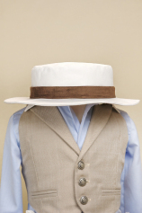 Un costum de vara in nuante delicate de lila si ivoire. Sacoul are un design deosebit cu detalii aurii. Pentru a completa aceasta tinuta, am adaugat o mini cravata in aceleasi culori si decorata cu un lant auriu.