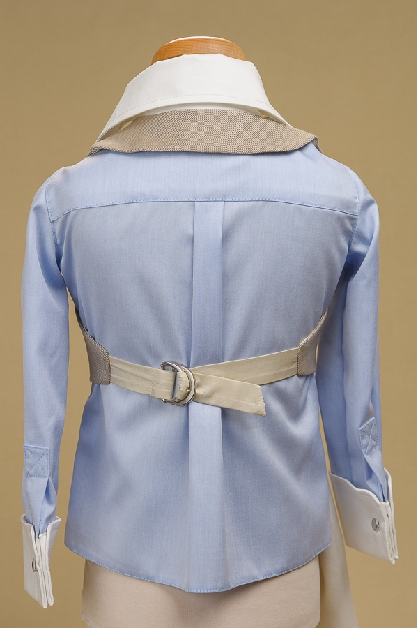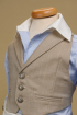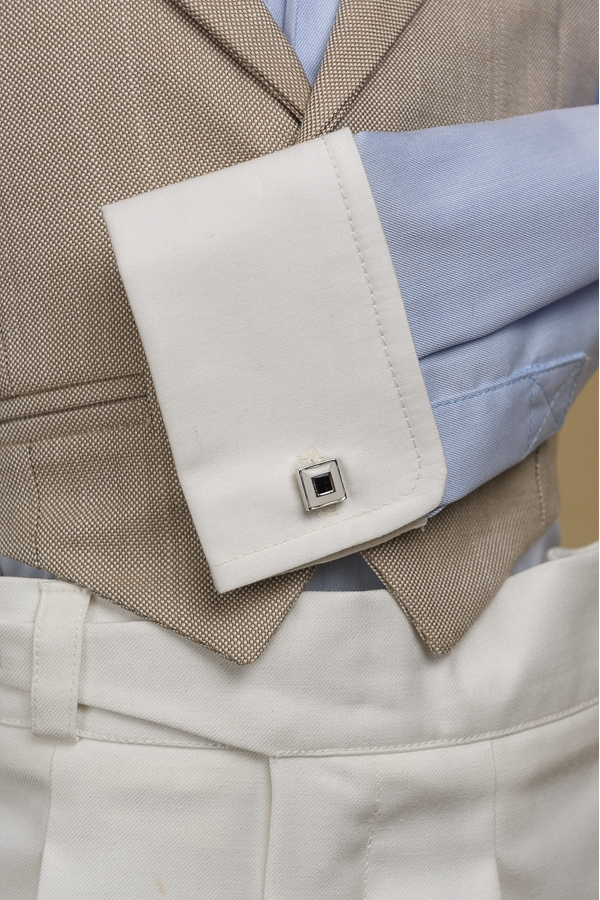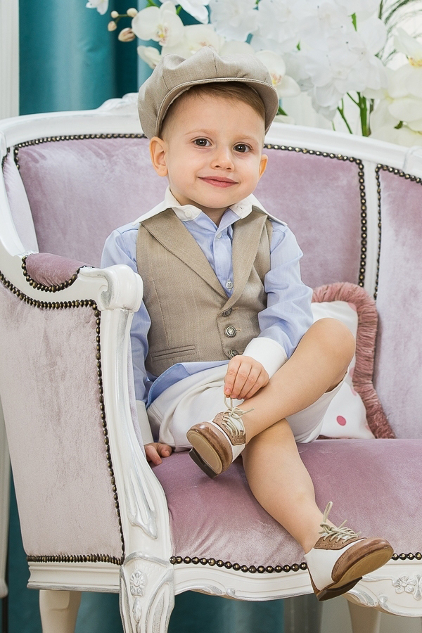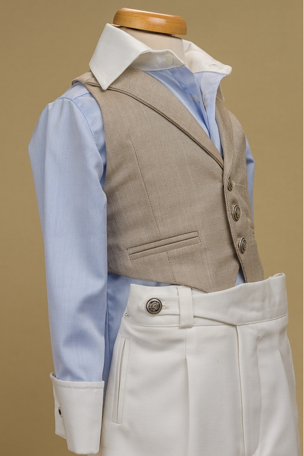 Detaliile si croiala acestui minunat costum sunt demne de un mic Gatsby: camasa cu butoni metalici, pantaloni din cashmir cu buzunare cu refileti, vesta chic cu spatele gol. Colectia "A party for Daisy".