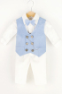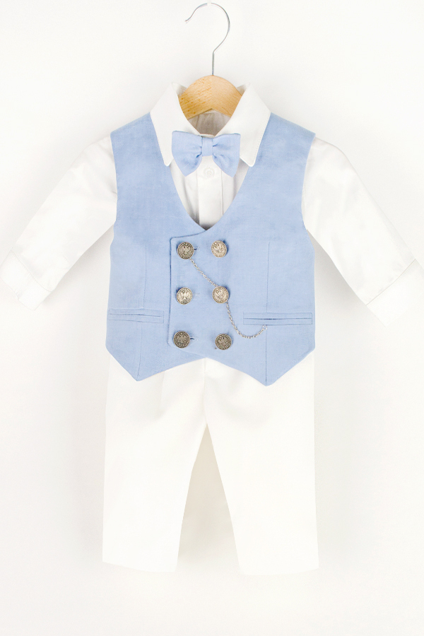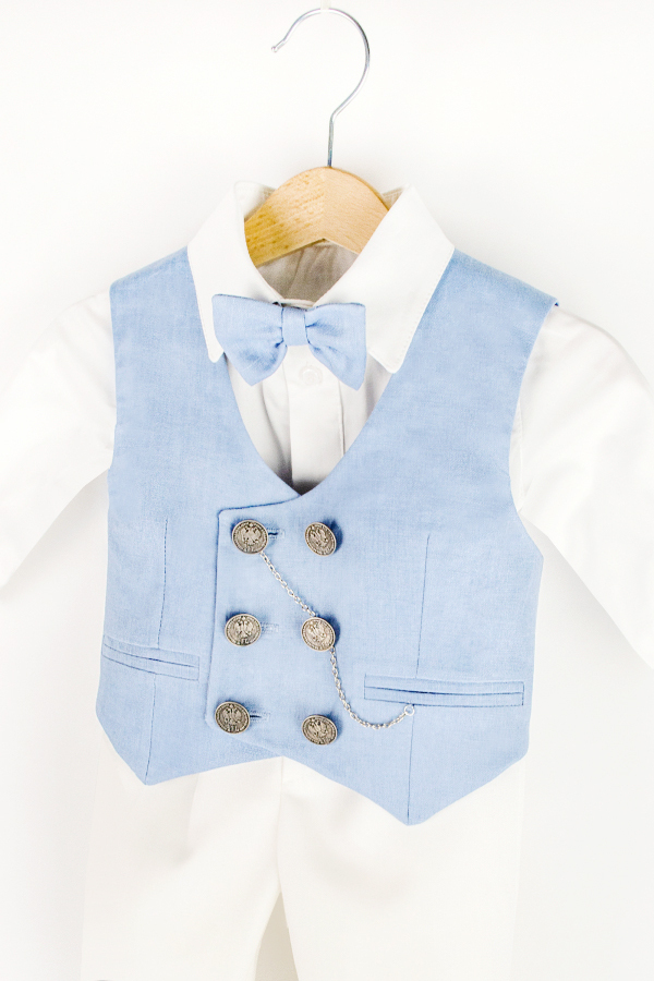 Costum in nuante placute de ivoire si bleu, potrivit pentru zilele mai calde din an. O combinatie vesela atat pentru bebelusi, cat si pentru baieti mai mari. Vesta din in.
