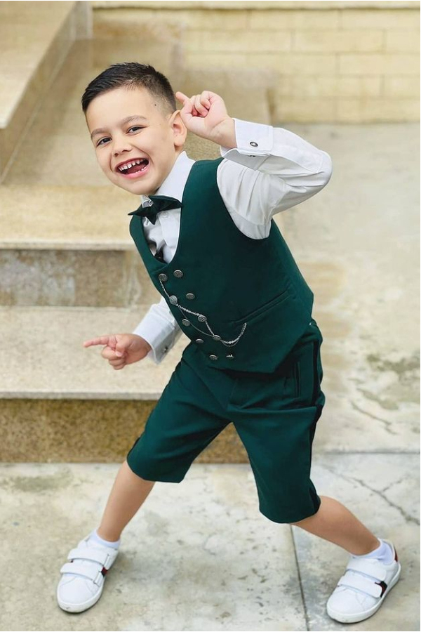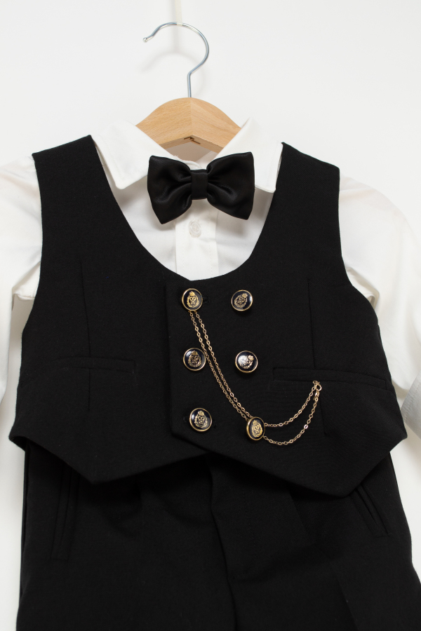 Piese: camasa cu body atasat (pentru varsta 0-1 an) si papion, vesta si pantalon cu elastic reglabil in talie;