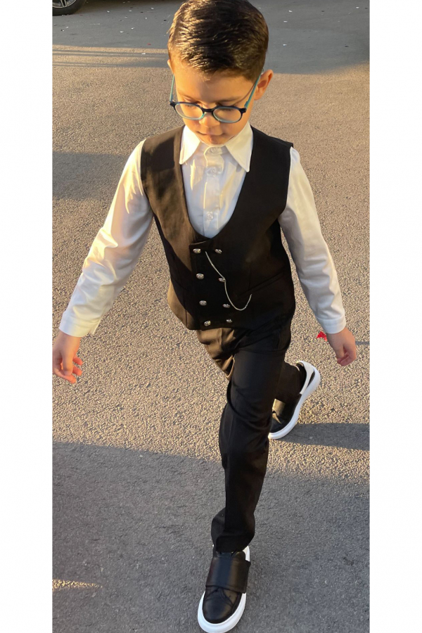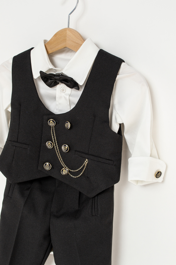 Costum elegant pe o combinatie clasica, dar foarte actuala, de stofa neagra si camasa alba, cu vesta sic la 6 nasturi si lant.