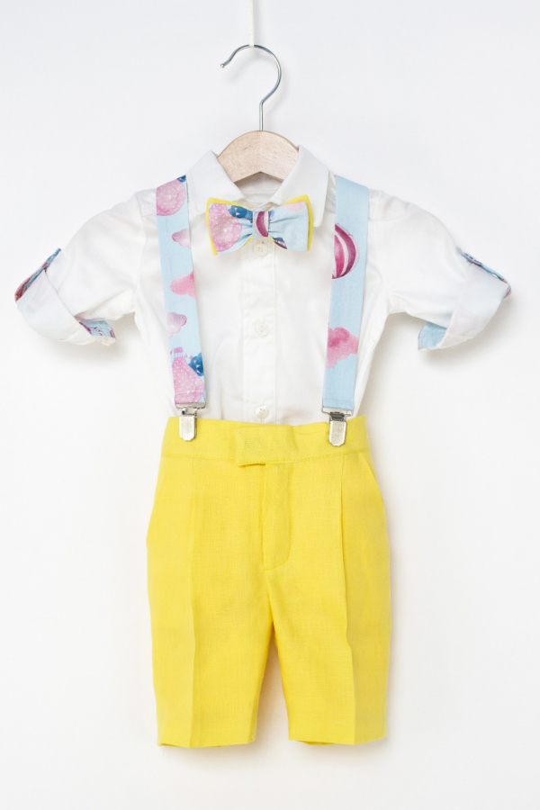 Costum vesel si elegant pentru baieti, realizat dintr-o camasa cu body din bumbac, pantaloni de in, si bretele si papion dintr-un bumbac cu imprimeu jucaus cu baloane si nori.