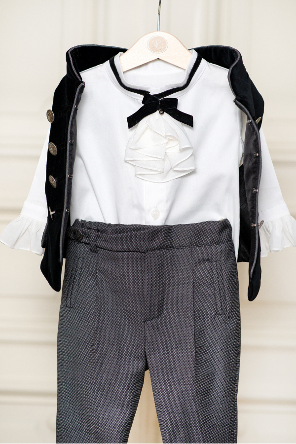 Un costum elegant pe o combinatie clasica, de neagru si alb, cu o vesta sic din catifea, decorata cu nasturi metalici. Camasa cu jabou si volane la maneci, aduce un plus de regalitate costumului. Tinuta perfecta atat pentru botez, cat si pentru baieti mai mari.