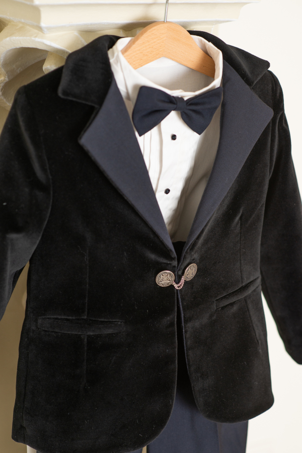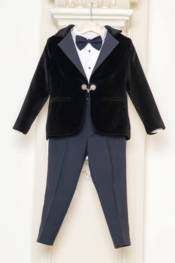 Costum de ocazie pentru baieti, intr-o combinatie foarte eleganta de catifea neagra si stofa neagra. Jacheta are, de asemenea, revere din stofa neagră, nasturi delicati și un design special de închidere.