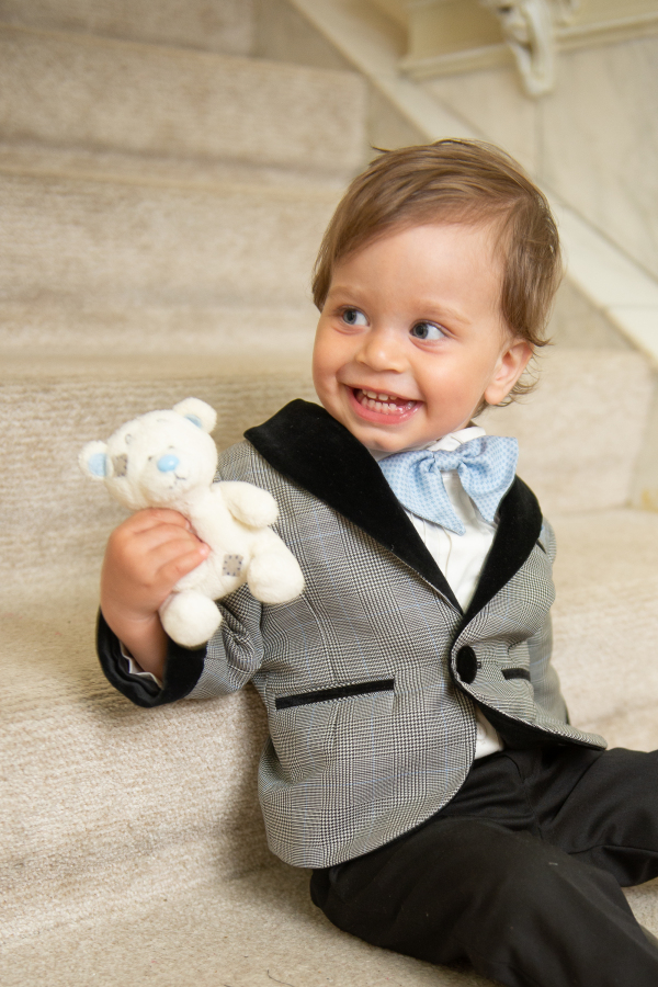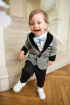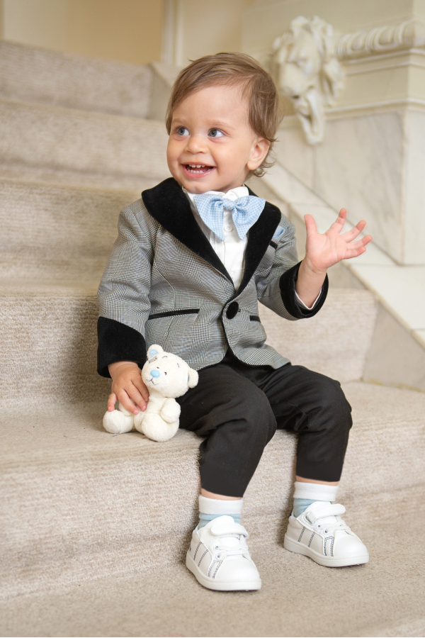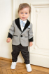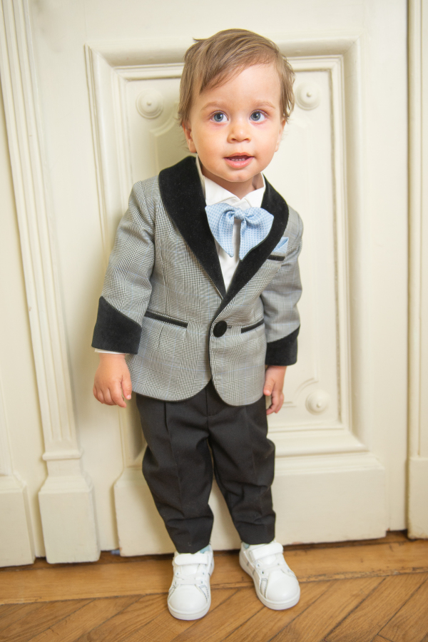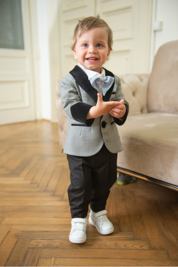Costum de ocazie speciala pentru baieti intr-o combinatie foarte eleganta de gri, negru si bleu. Jacheta are detalii de catifea pe maneci si rever. Papionul delicat adaugă un plus de glamour costumului.