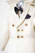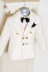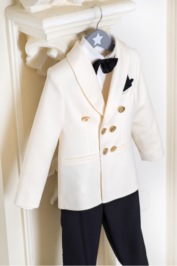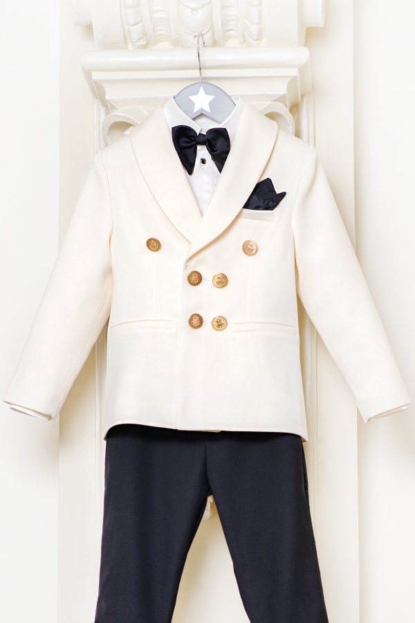 Un sacou clasic ivoire cu nasturi aurii, asortat la o pereche eleganta de pantaloni negri. Un model perfect pentru sarbatorile de iarna, nunta sau botez!e
