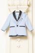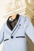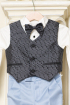 Costum elegant pentru copii, cu sacou si vesta, de culoare bleu, cu detalii negre si camasa alba, cu bijuterie si lant la rever. Vesta si papionul din matase neagra cu buline completeaza farmecul unei tinute speciale!